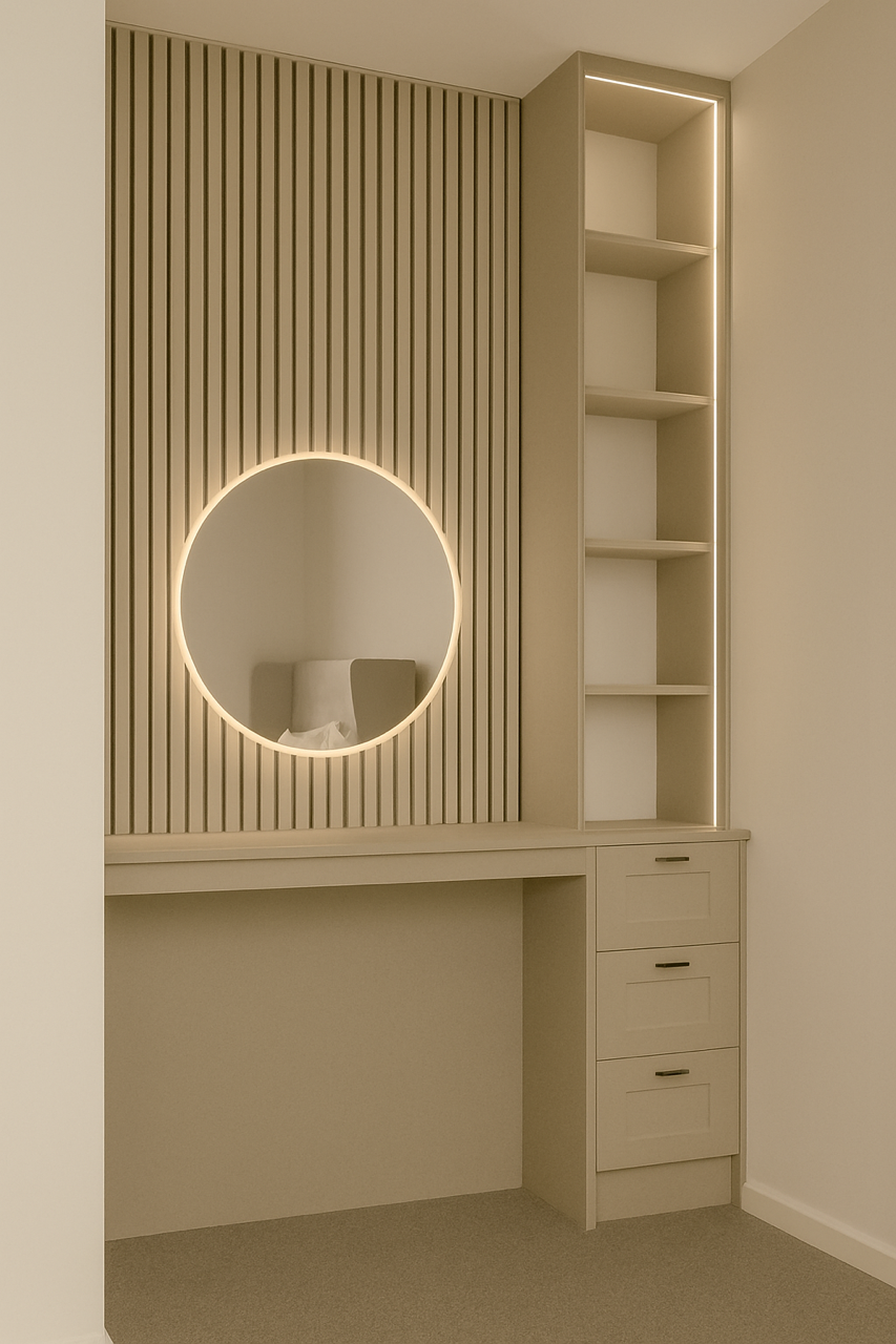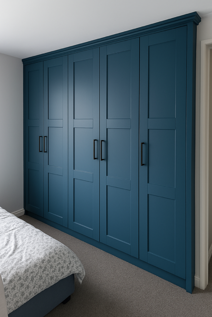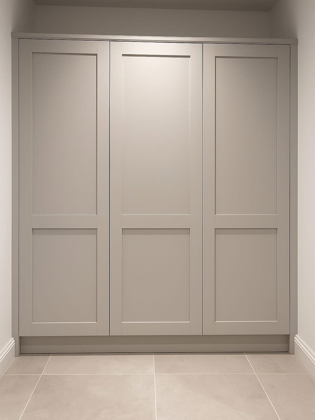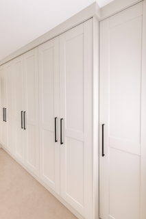 Every wardrobe is made to measure and built around your needs, with internal layouts tailored for hanging space, drawers, shelves, and accessories. Choose from a range of finishes, from traditional shaker styles to contemporary flat-panel doors with soft-close fittings and premium hardware as standard.
